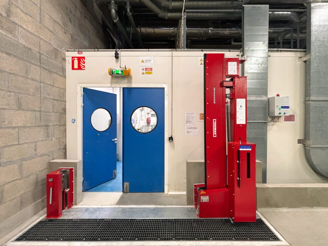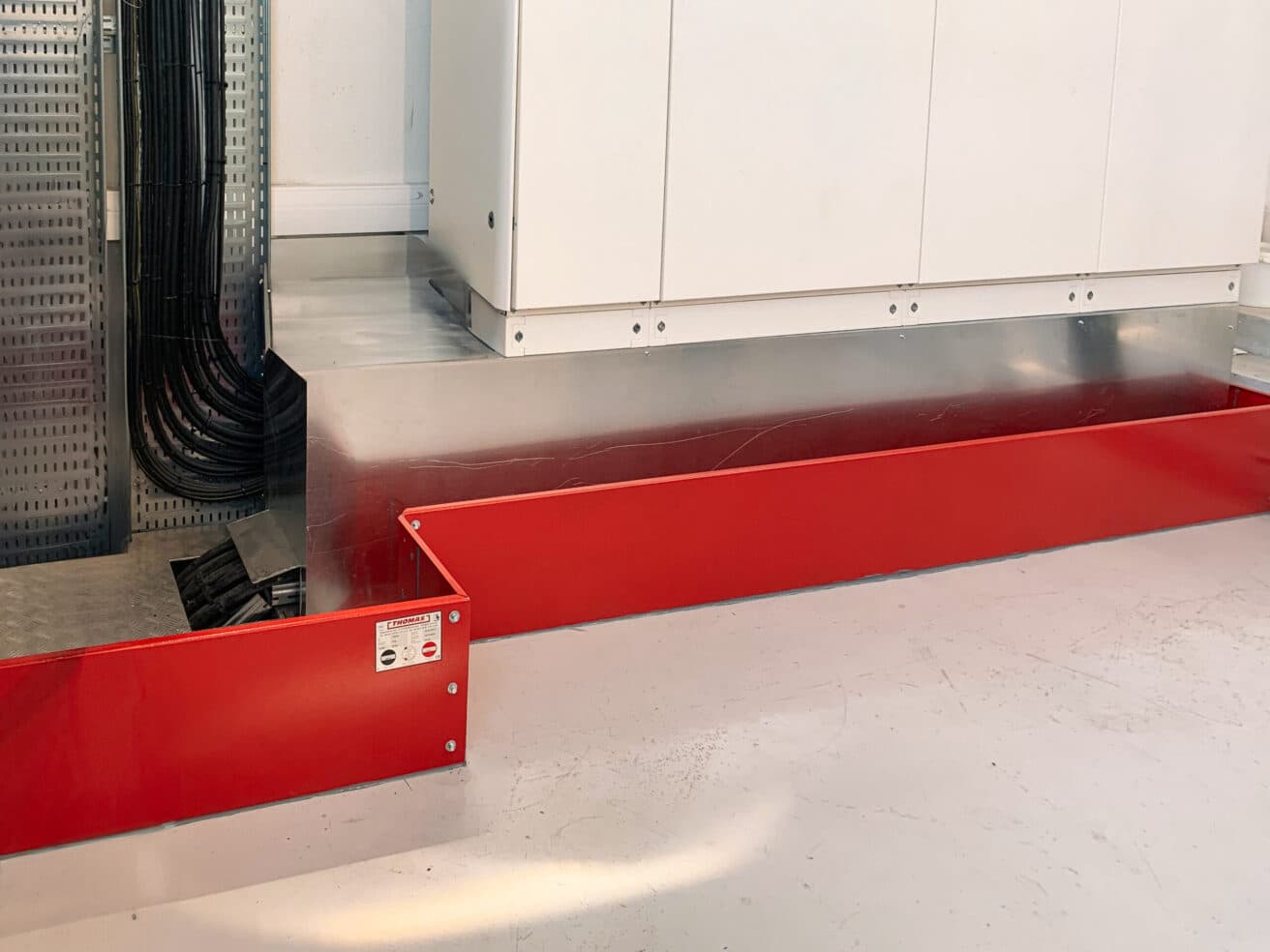 Parmi les barrières approuvées FM installées, la barrière pivotante semi-automatique TAB VDF présente des caractéristiques techniques remarquables. Elle est composée de profilés en aluminium creux à chambres, avec un bouclier de protection thermique à l’avant et à l’arrière, ainsi que de joints en PTFE, matière offrant une résistance chimique et thermique élevée. En position de repos, cette barrière approuvée FM se tient verticalement, perpendiculaire à la porte, et est maintenue par un électro-aimant. Lorsqu’une alerte est détectée, l’aimant est libéré, ce qui déclenche une fermeture lente grâce à un vérin hydraulique. Cette fermeture contrôlée prend environ 20 secondes. La barrière est guidée latéralement et équipée d’un joint synthétique en EPDM, résistant aux solvants, garantissant ainsi une étanchéité parfaite. Une fois en position basse, elle est automatiquement verrouillée par un étrier tendeur. L’ouverture s’effectue via une pompe hydraulique. Le système peut également être déclenché par un détecteur de liquide, une coupure de courant ou un interrupteur manuel. Un gyrophare rouge et un klaxon signalent la fermeture, tandis qu’une lampe verte indique que le dispositif est prêt à fonctionner. En cas de besoin, une commande d’urgence sans énergie permet une activation manuelle. Ce modèle est approuvé FM Class 4985, attestant de sa résistance à des températures allant jusqu’à 1000 °C pendant 30 minutes.
