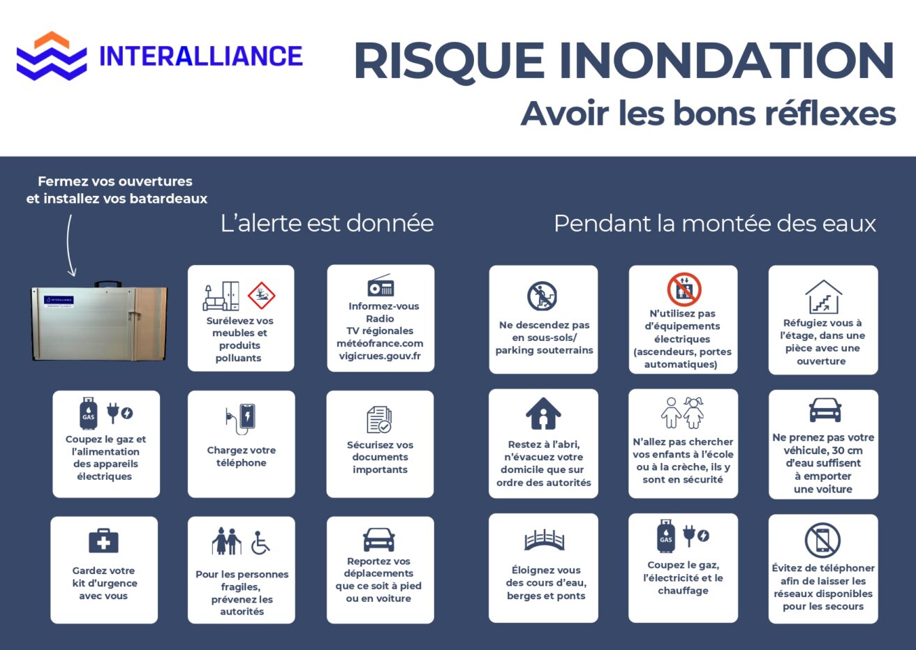 Une fois les protections en place, concentrez-vous sur votre sécurité et celle de vos proches. Nous vous présentons les gestes essentiels de sécurité en quelques points. Dans un objectif d’acculturation au risque inondation, nous avons réalisé une carte avec des pictogrammes que nous remettons à nos clients, lors de la pose des batardeaux. Pratique, elle peut se mettre à l’entrée ou sur le frigidaire !